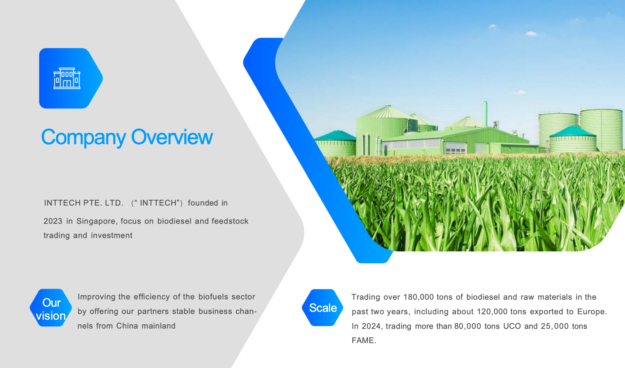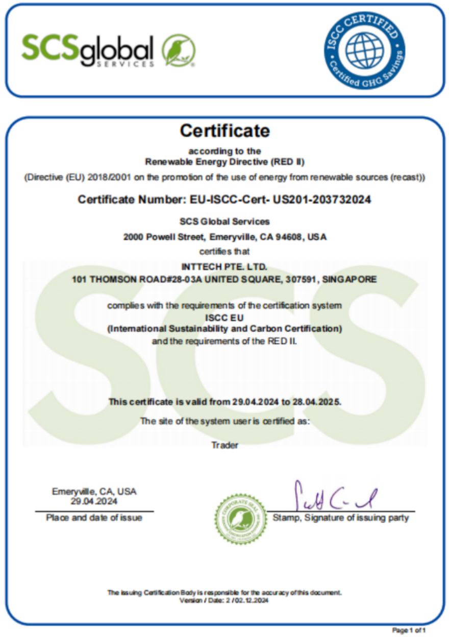 INTTECH has a strong commitment to certification, traceability, and transparency throughout the entire supply chain from feedstock collection to biofuel production. Our products comply with the European Renewable Energy Directive (RED) and have ISCC certification.