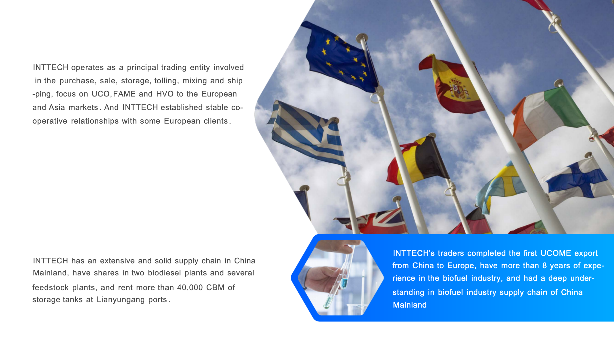 INTTECH has an extensive and solid supply chain in China Mainland , and participated in the investment of two biodiesel plants and several feedstock plants , and rent more than 40,000 CBM of storage tanks at Lianyungang port.